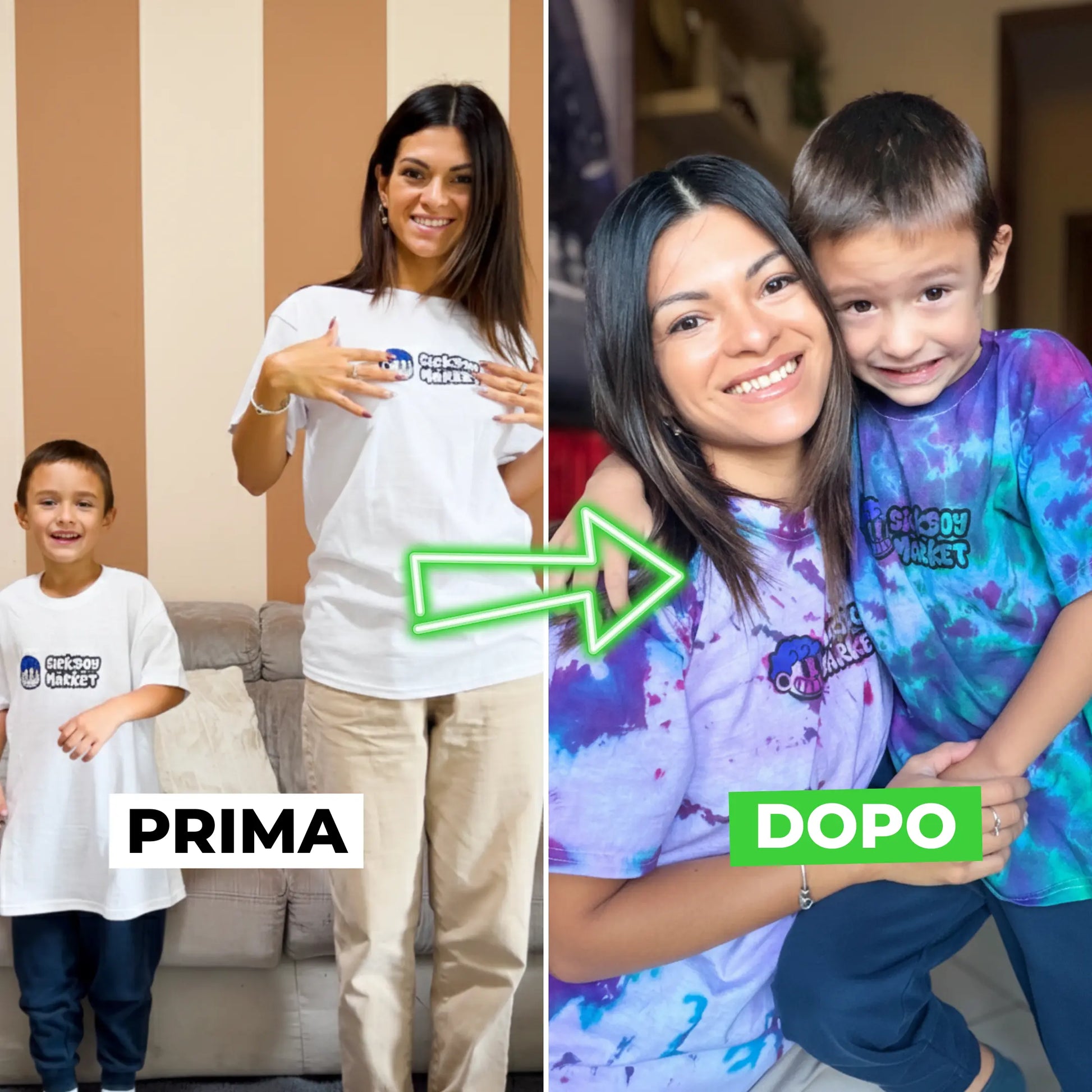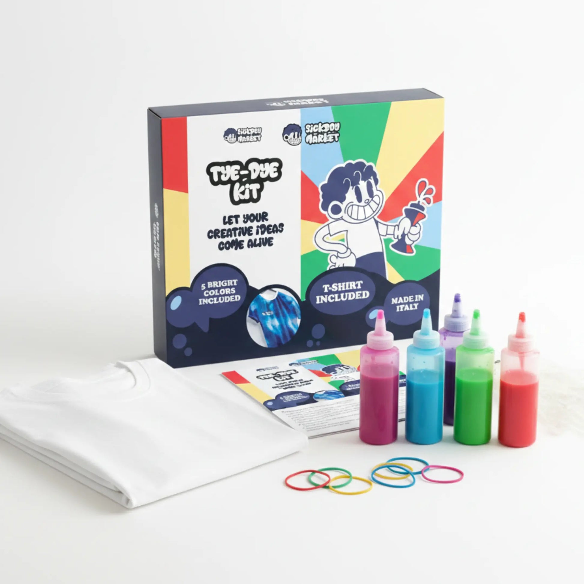 All’interno trovi tutto ciò che serve senza aggiungere nulla: cinque colori pronti all’uso (rosso, viola, azzurro, verde, fucsia), elastici, guanti, istruzioni chiare e una maglietta Sickboy Market in cotone, pensata per essere personalizzata e trasformata in un pezzo unico!