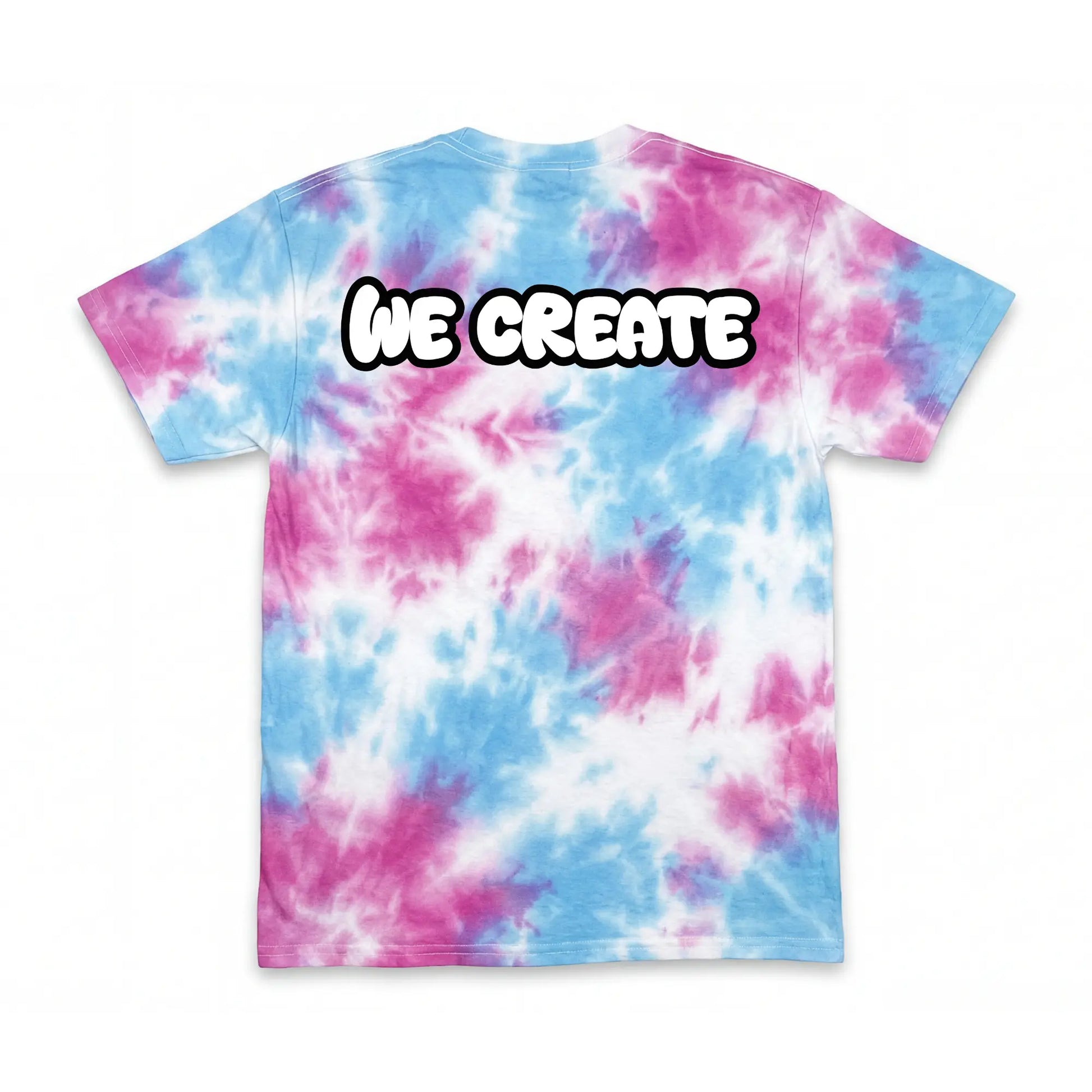 Perla Tee. Tie-dye fucsia e azzurro, pattern unico su ogni pezzo. 100% cotone, mano morbida, vestibilità pulita. Colori netti, contrasto deciso, identità immediata. Ogni maglietta è diversa.